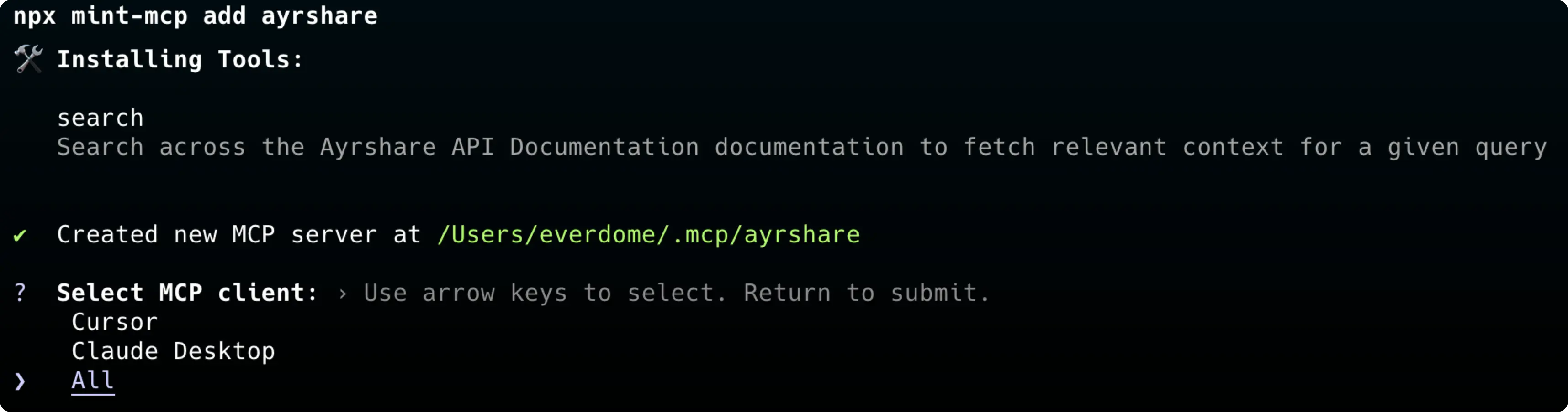 Restart the app to apply the changes. In Cursor, you can test the MCP connector by typingHow do you publish a post in Ayrshare. Use the MCP server.